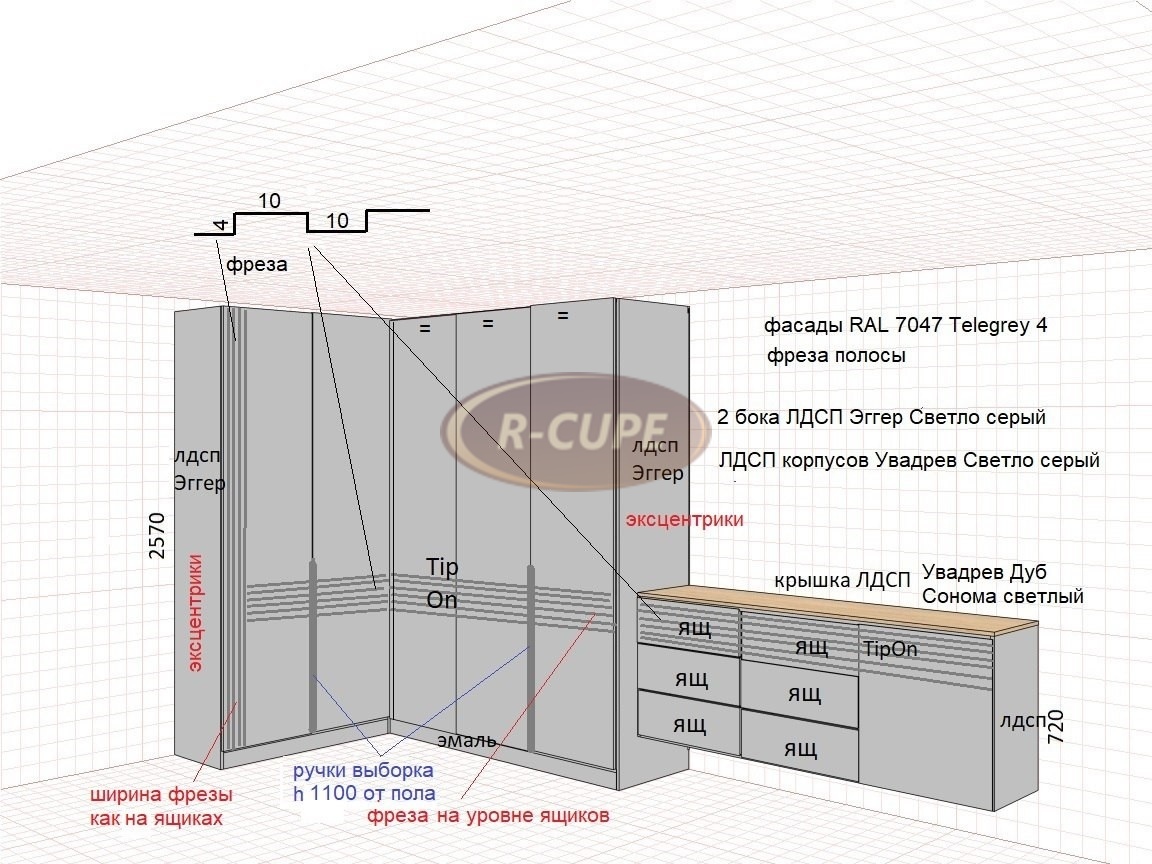Замерщик-дизайнер, приедет к вам домой и сделав замер спроектируют вашу мебель на компьютере с помощью дизайнерской программы, в которой вы сможете увидеть ваш шкаф со всех сторон.
