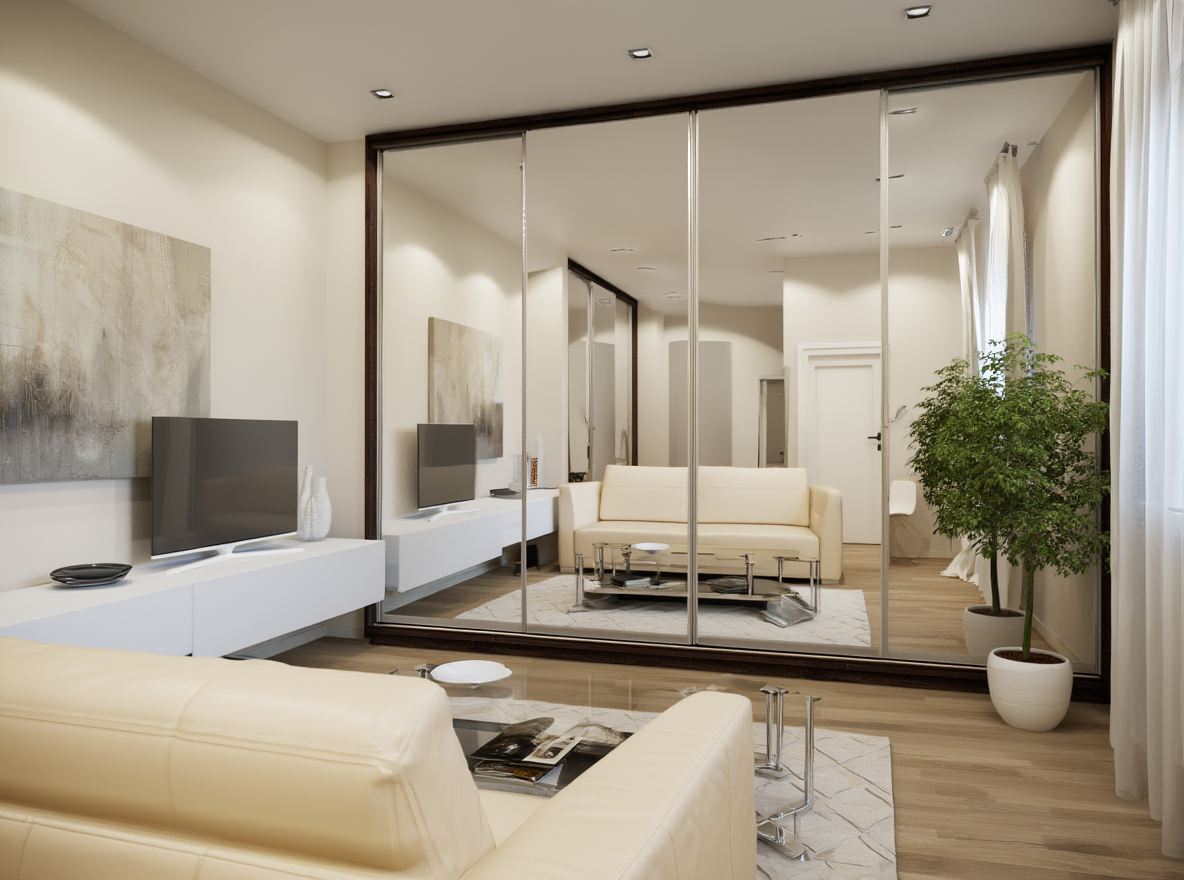 Зеркальные фасады визуально расширяют комнату и отражают свет, что особенно важно для квартир с недостатком освещения. Материалы уровня ЛДСП Egger обеспечивают устойчивость к нагрузкам и аккуратный внешний вид.