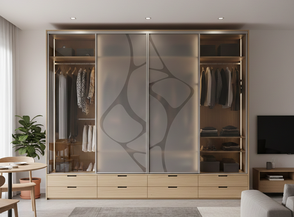В хрущевках и студиях встроенный шкаф-купе выбирают чаще всего. Конструкция монтируется в нишу или между стенами, без боковин и задней стенки. Плюс — максимальная экономия места и точная подгонка под геометрию помещения. Минус — сложнее перенести при переезде.